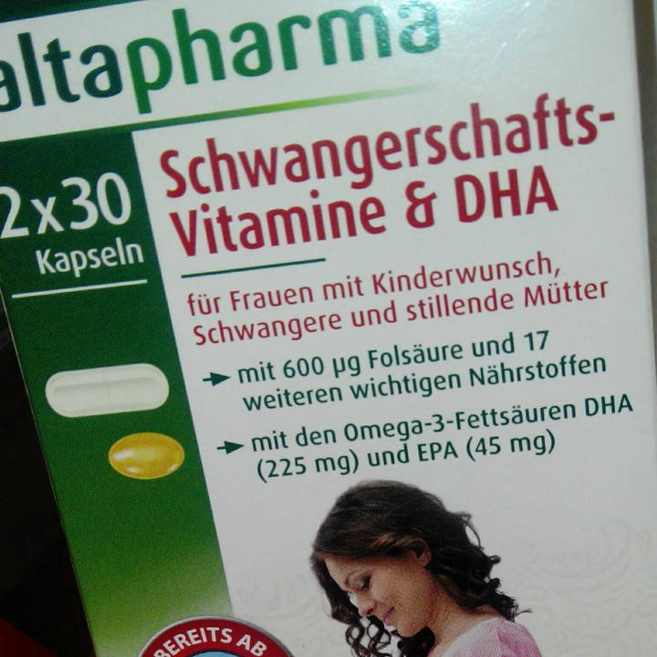 altapharma Вагітність Вітаміни і DHA: Вагітні та жінки мають підвищену потребу у вітамінах і мінералах. Altapharma Вагітність Вітаміни і DHA, забезпечує належним чином збалансований склад вітамінів, мінералів і незамінних жирних кислот і може вже з моменту, що мають дітей до кінця лактації повинні бути прийняті. Фолієва кислота має функцію в діленні клітин і сприяє зростанню материнських тканин під час вагітності. Залізо підтримує утворення червоних кров'яних тілець і нормальний транспорт кисню в організмі. Вітаміни В1, В2, В6 і В12 сприяє нормальному енергетичного метаболізму і нормальної функції нервової системи. Йод підтримує нормальне виробництво гормонів щитовидної залози і нормальної функції щитовидної залози. Прийом DHA від матері сприяє нормальному розвитку мозку і очей у ненародженої дитини і грудне вигодовування. Цей позитивний ефект, коли на додаток до рекомендованої добової дози для дорослих омега-3 жирних кислот (тобто 250 мг ДГК і ЕПК) 200 мг DHA, щоб приймати щодня. - без лактози - глютен